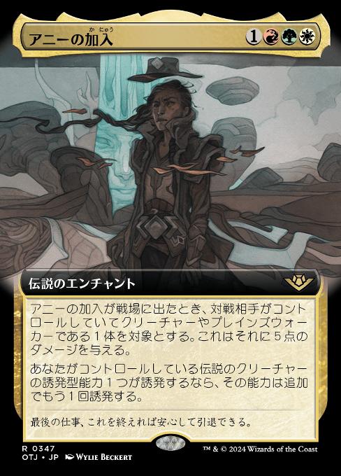 訳文置換効果はアニーの加入の最後の能力の影響を受けない。たとえば、あなたのコントロール下で+1/+1カウンターが1個置かれた状態で戦場に出る1/1のクリーチャーは、追加の+1/+1カウンターを得ることはない。