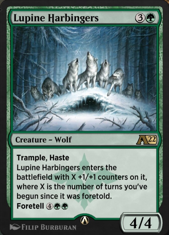 Lupine Harbingers enters the battlefield with X +1/+1 counters on it, where X is the number of turns you've begun since it was foretold.