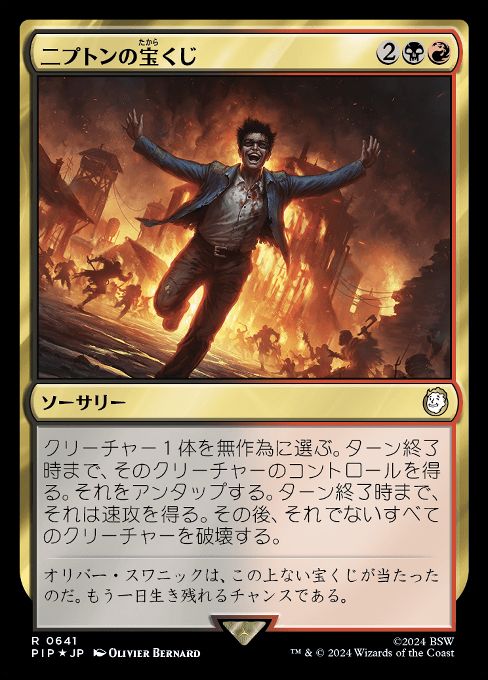 クリーチャー1体を無作為に選ぶ。ターン終了時まで、そのクリーチャーのコントロールを得る。それをアンタップする。ターン終了時まで、それは速攻を得る。その後、それでないすべてのクリーチャーを破壊する。