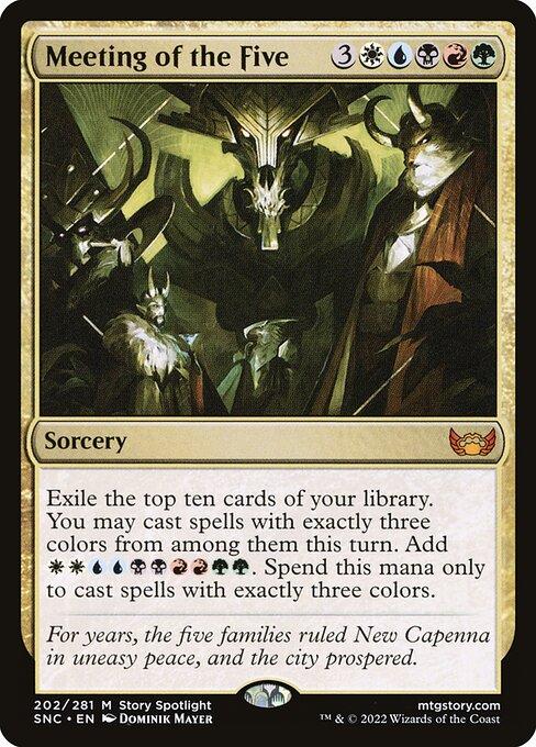 原文The mana created by Meeting of the Five can be spent on any portion of the cost for a spell with exactly three colors, including any generic cost component or additional costs it has.