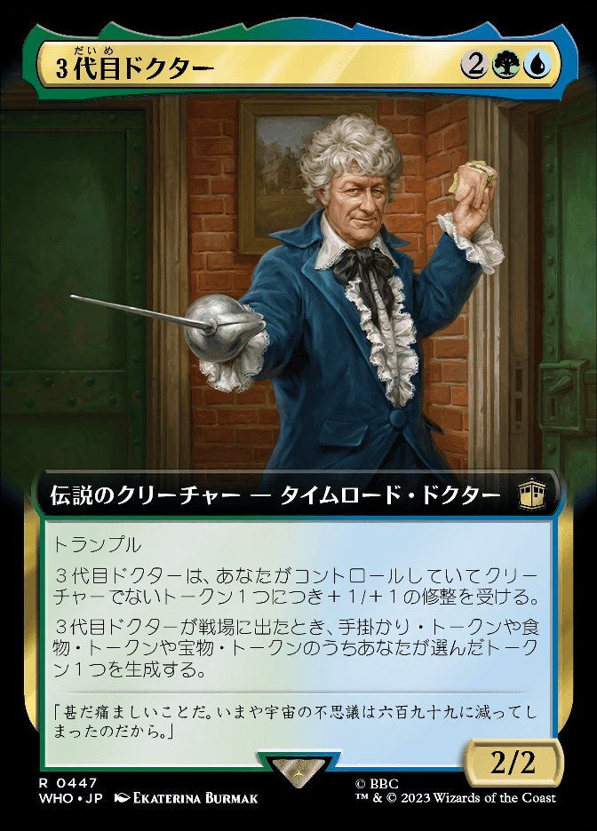 3代目ドクターが戦場に出たとき、手掛かり・トークンや食物・トークンや宝物・トークンのうちあなたが選んだトークン1つを生成する。
